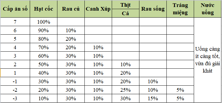 Ăn thực dưỡng sẽ có các cấp bậc khác nhau để người mới áp dụng có thể bắt đầu từ những bước đầu tiên sau đó nâng độ khó dần với nguyên tắc ăn chặt chẽ hơn, đến bài ăn cao nhất là bài ăn thực dưỡng số 7, chỉ sử dụng gạo lứt và muối mè. Cụ thể các bài ăn thực dưỡng như sau: