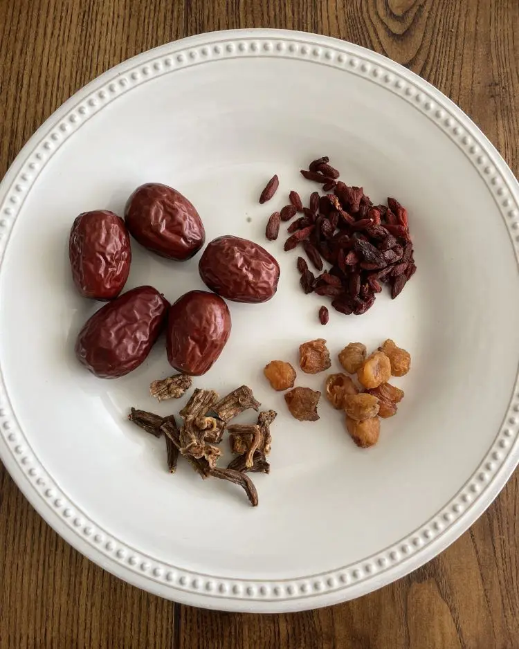 50g quả táo đỏ, 1-4 thìa canh kỉ tử, 10 miếng nhãn nhục, 1.2l nước,