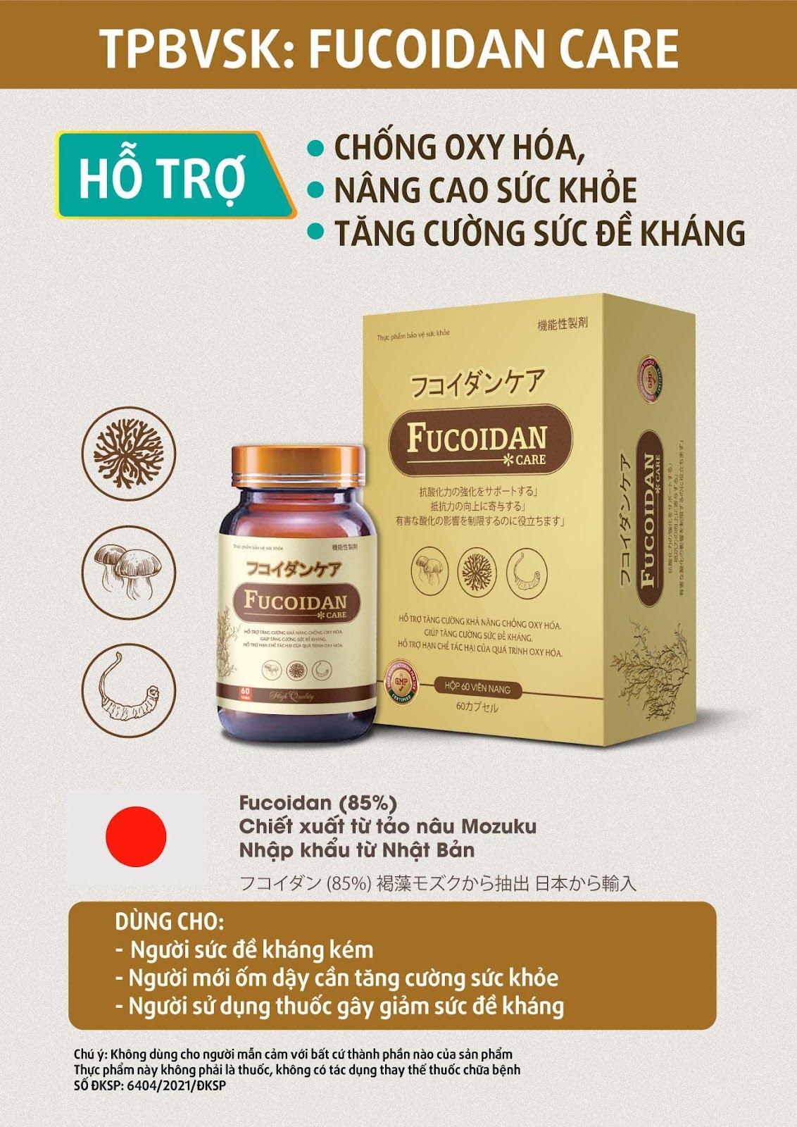 Fucoidan Care là giải pháp chuyên biệt hỗ trợ hạn chế quá trình oxy hóa, hỗ trợ nâng cao sức đề kháng và hỗ trợ hạn chế tác hại của quá trình oxy hóa và bồi bổ cơ thể với sự kết hợp của 3 hoạt chất vàng là: Fucoidan, Betaglucan và Đông Trùng Hạ Thảo. Các hoạt chất này đều có lợi cho sức khỏe, nhất là với bệnh nhân ung bướu, cụ thể các nghiên cứu đã chỉ ra: